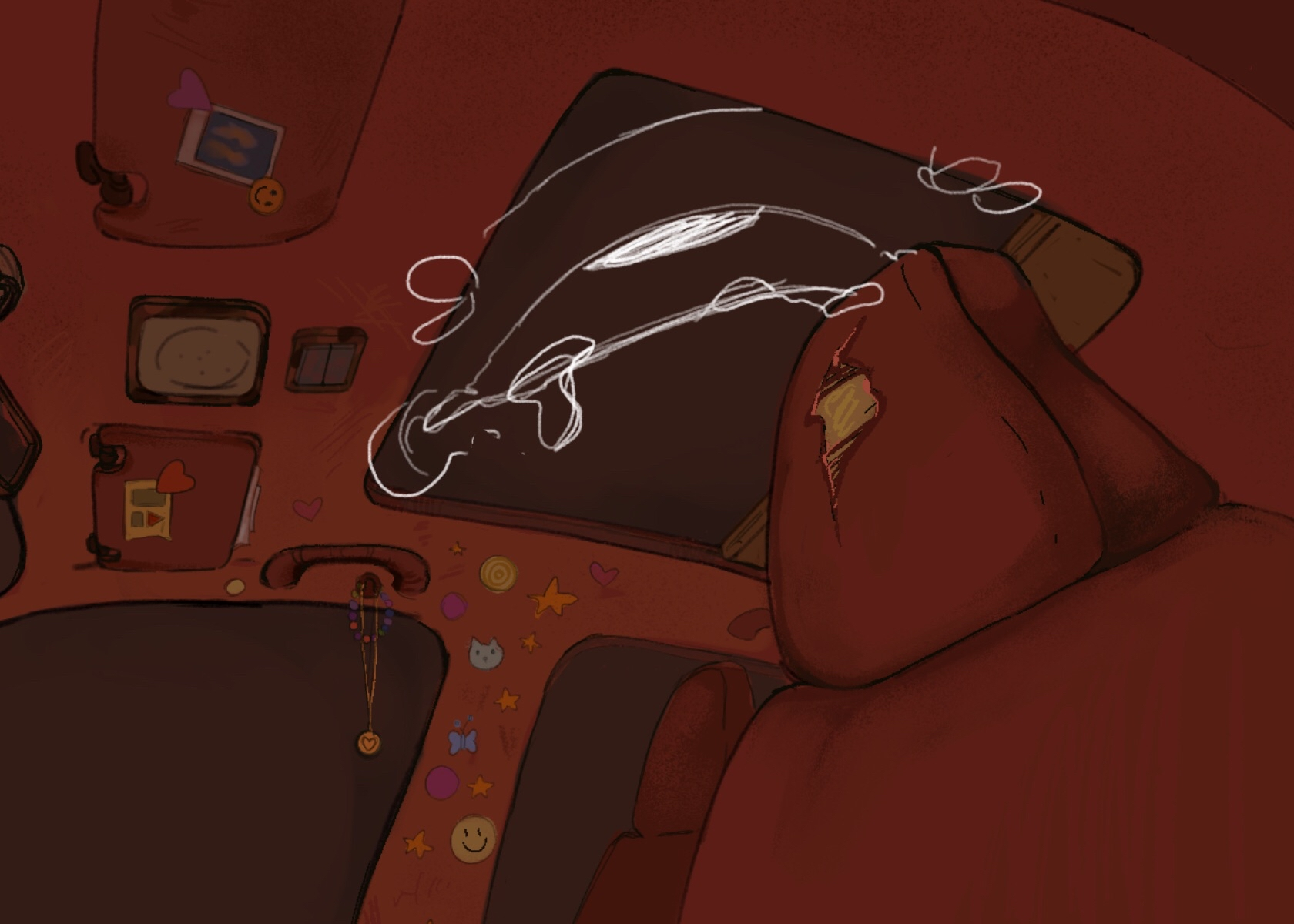 Environmental storytelling: the entire car interior tells fragments of the story, the objects, the lights, and of course the radio.